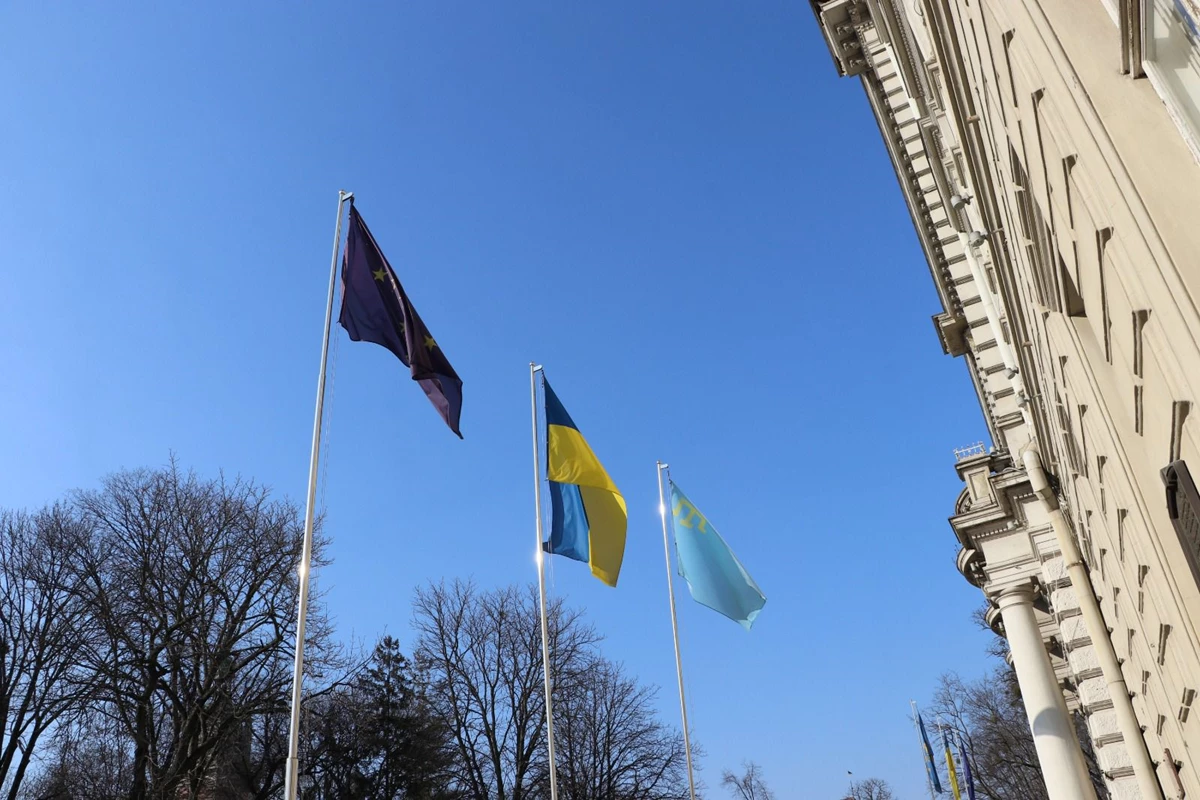 26 лютого в Україні відзначають 11-ту річницю початку спротиву окупації Криму. З цієї нагоди перед будівлею Львівської обласної військової адміністрації підняли прапор кримськотатарського народу.